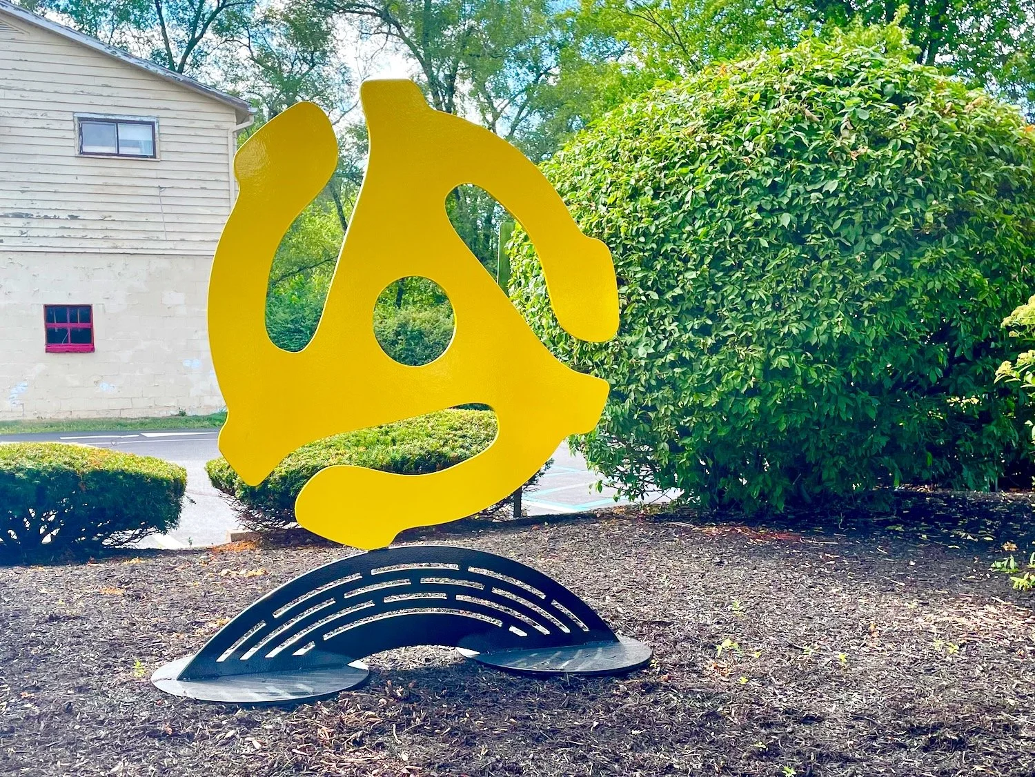 45 RPM (45 in Version) transforms a familiar symbol of analog music into a bold, minimalist monument. The sculpture draws directly from the iconic shape of the 45 RPM adapter; an object once essential for playing 7-inch vinyl singles. Rendered in steel with vivid yellow paint, the form hovers above a curved, black base that evokes the grooves of a record or the arc of a stylus in motion.