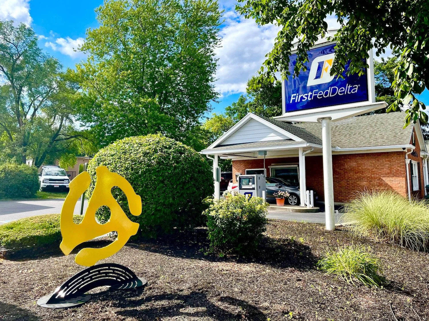 The piece invites nostalgia while celebrating the tactile rituals of listening in a pre-digital age. With its clean lines and vibrant palette, 45 RPM distills a moment of cultural memory into graphic simplicity. Positioned in a public setting, it becomes both a sculptural pause and a quiet tribute to the enduring power of music to mark time, identity, and emotion.
